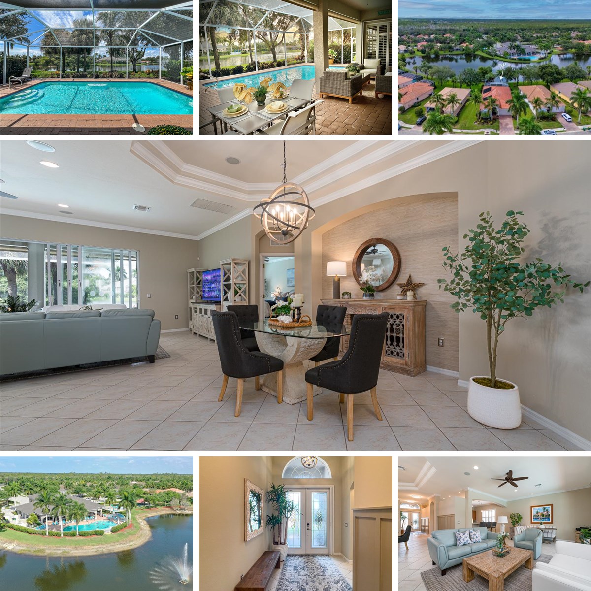 Goregous Coastal Luxury & Resort-Style 3 bed 2 bath Single Family luxury home with FULL-SIZE Solar-Heated Saltwater POOL, perfect for year-around enjoyment. Offering the ideal blend of elegance, wellness & relaxation, a true private-retreat where every day feels like a vacation! Nestled on tranquil LAKE w/WESTERN EXPOSURE! Enjoy breathtaking SUNSETS that paint the sky each evening. A true Southwest Florida lifestyle experience! Move-In Ready with designer touches for the Discriminating Buyer. Beautiful Double Door Front Entry, NEW AC & Manual HURRICANE SHUTTERS providing peace of mind, NEW Professional Landscaping. Large Kitchen for the Gourmet Chef in your Life, new stainless appliances, breakfast bar, a separate Formal Dining Room. Interior w/vaulted ceilings, tile & wood floors, recessed lighting, crown molding, sound system w/speakers, security system, white plantation shutters. Lots of natural light with spacious living room, glass sliders that open seamlessly to large screened-in lanai, pool & outdoor living space! Plenty of room to relax & soak up the sun poolside, or entertaining with friends & family! Large Master Suite w/view of LAKE. Luxurious Master Bath w/double sinks, large shower & tub, large His & Hers Walk-in Closets, Spacious 2nd & 3rd Bedroom & Space to work remotely if you must! 2nd bath with tub shower combo! Laundry room w/Sink & Cabinets, 2 Car Garage! This beautiful property is located in the small sought-after gated boutique neighborhood - Reflection Lakes of Naples offering an active lifestyle! Low HOA Fees include irrigation water, lawn maintenance & resort style amenities that include pool, spa, kids pool area, fitness center, social room, library, bocce ball, & play area. Nestled perfectly between Marco Island & downtown Naples. Short drive to upscale shopping, dining on 5th Ave, Third Street South, Design District, Naples Botanical Gardens, Entertainment, Golfing, Boating, Fishing, Kayaking, Tennis, Pickleball, Famers Markers, Art Shows & the white sandy Beaches! Don't wait to schedule your private showing today! Live year around or spend your winters in Paradise!